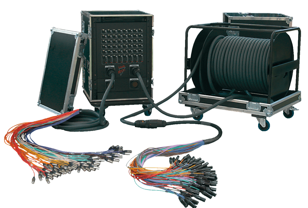 SB Gold48, 56 and 64 channel Stage Boxes, have been purposely designed to satisfy the need of distributing signals in large venues.Ideal when used with individually shielded multi-pair eurocable (e.g. 48, 56 and 64 pairs) on cable reels and with LK audio multi-pin connectors (e.g. 150 and 200 pins). These Stage Boxes, manufactured in 19’’ rack boxes, feature individual Ground Lift switches and are also available with passive splitters.All the connector contacts used in the SB Gold Stage Box (XLR and LK multipin) are plated in gold, to guarantee the maximum contact reliability. The HD 600 cable reel can store up to 100 meters of 48, 56 or 64 individually shielded pairs eurocable (the use of a Flight Case is strongly recommended).